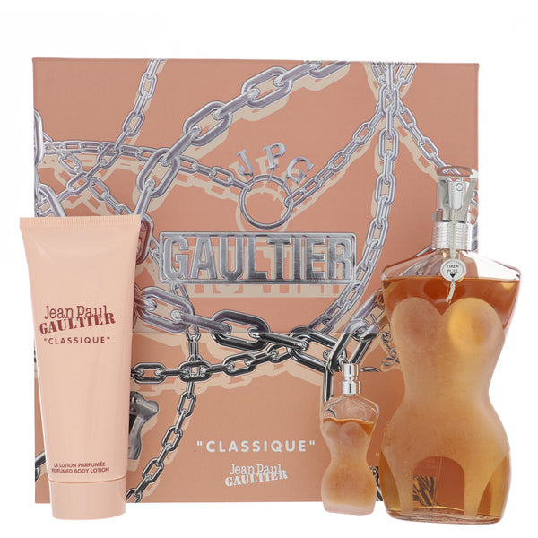 Classique By Jean Paul Gaultier Perfume 3 Piece Gift Set - 3.4 Oz Eau De Toilette Spray, 0.2 Oz Eau De Toilette Splash, 2.5 Oz Body Lotion For Women - Gift Set